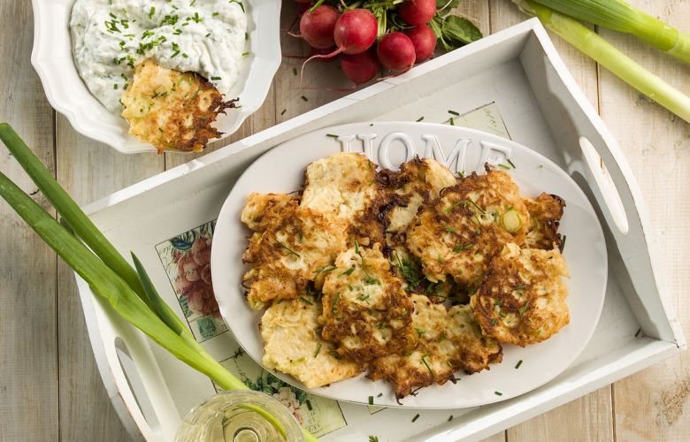 Upečené placky podávame s jogurtovo-bryndzovým dipom a pre veľmi hladných aj so zemiakmi uvarenými či pečenými v šupke.