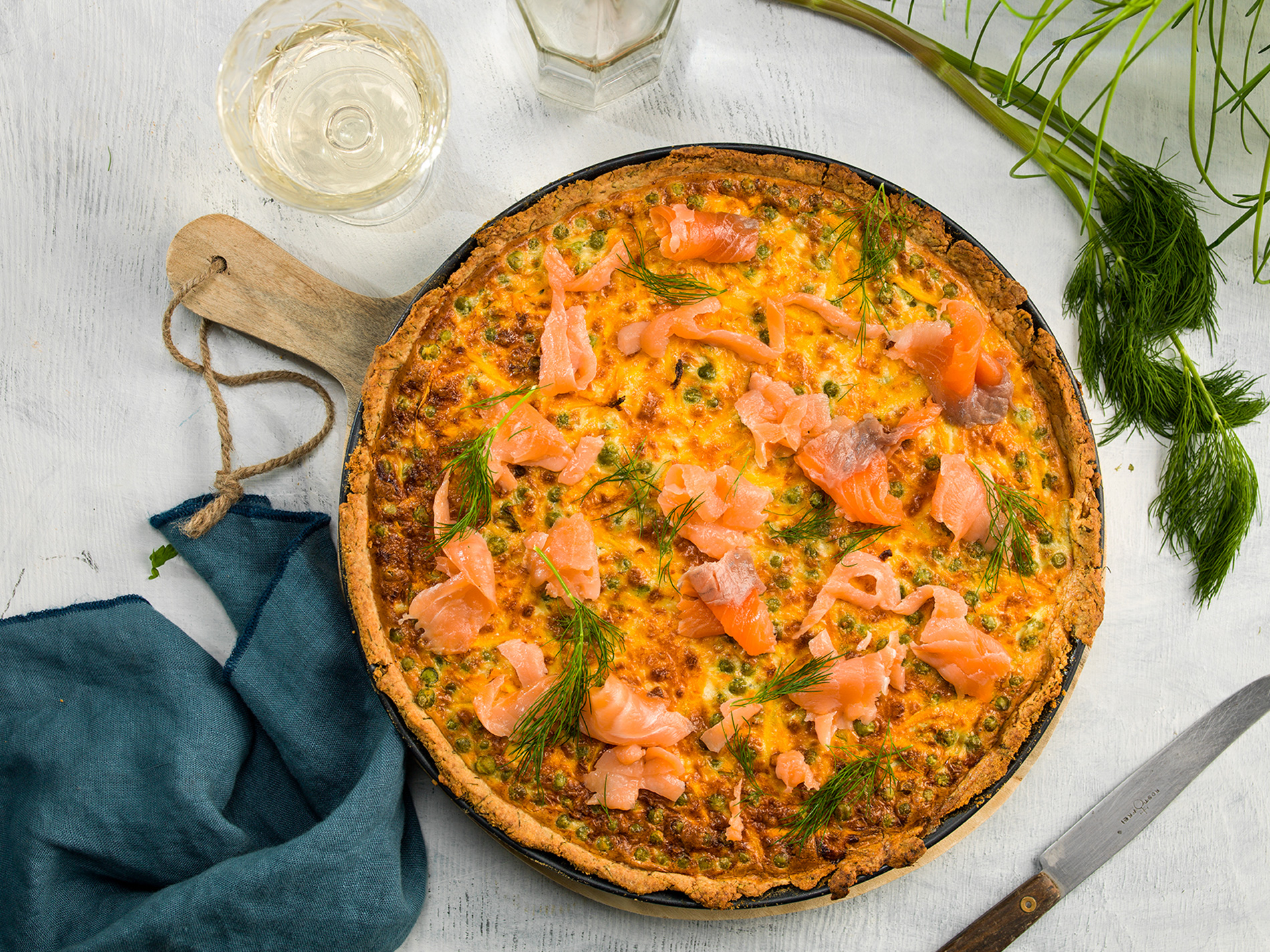 Rúru vyhrejeme na 200 °C, v mise zmiešame bryndzu, vajcia, mlieko a horčicu. Na vychladené cesto rozdelíme strúhanku, pripravenú zeleninu aj pásiky lososa.