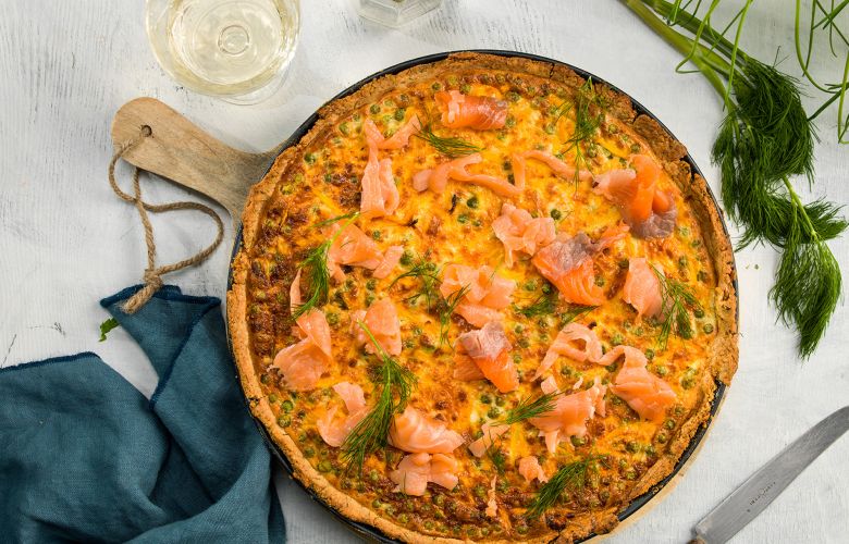 Kým sa cesto chladí, uvaríme hrášok. Stačí asi 5 minút v osolenej vriacej vode. Scedíme, prepláchneme studenou vodou a necháme dobre odkvapkať. Mrkvu olúpeme a nastrúhame. Plátky lososa nakrájame na pásiky.
