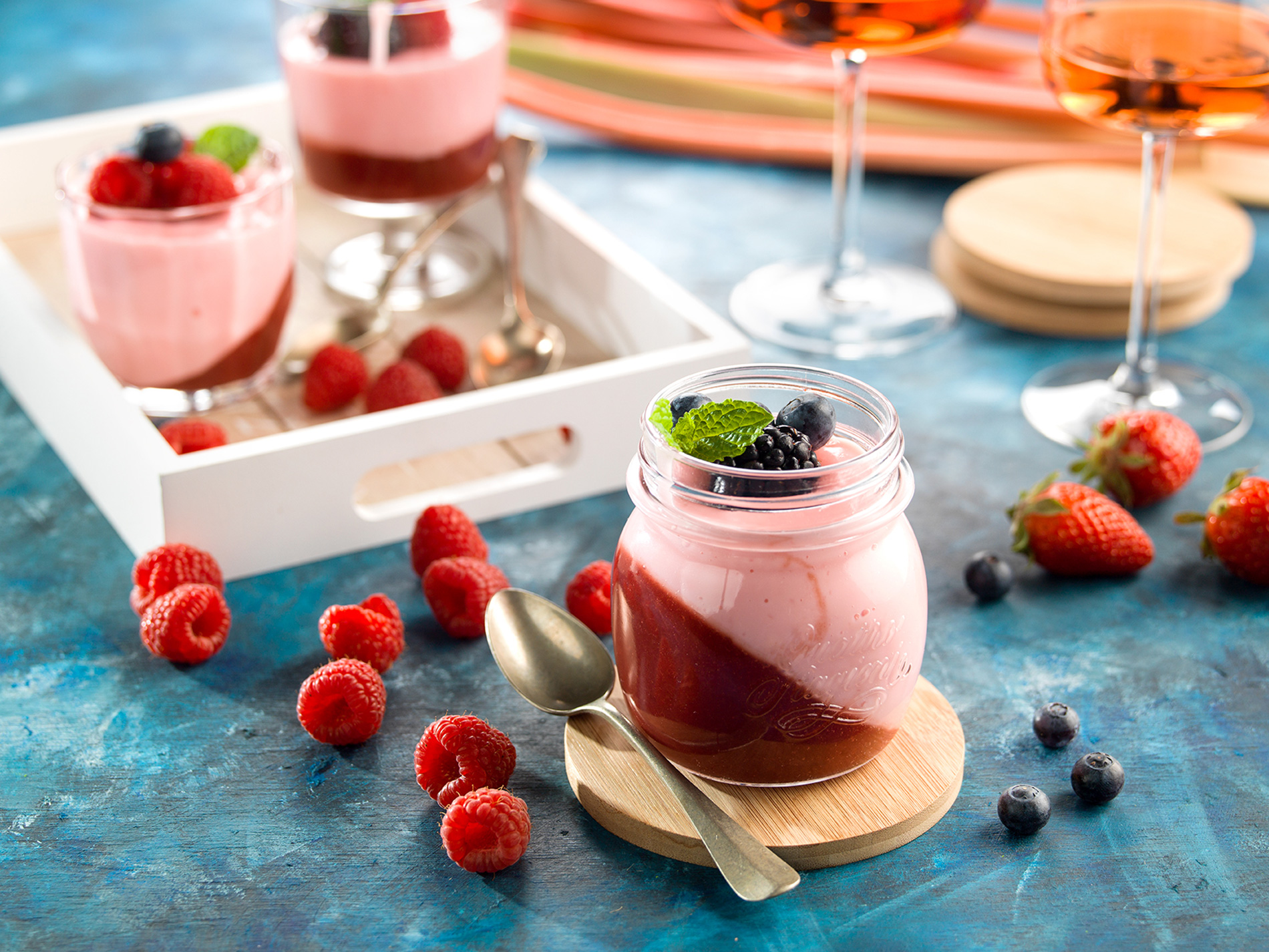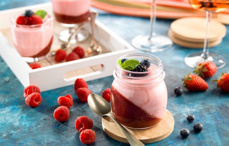 Mafinový plech prikryjeme utierkou a 4 poháre s objemom 250 ml postavíme našikmo do 4 jamiek v plechu. Prvé pyré rozdelíme do pohárov a aj s plechom dáme na 2 hodiny do chladničky.