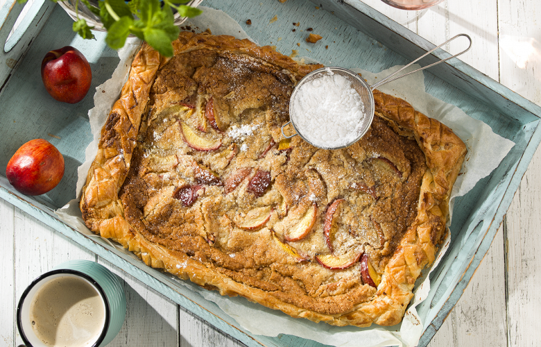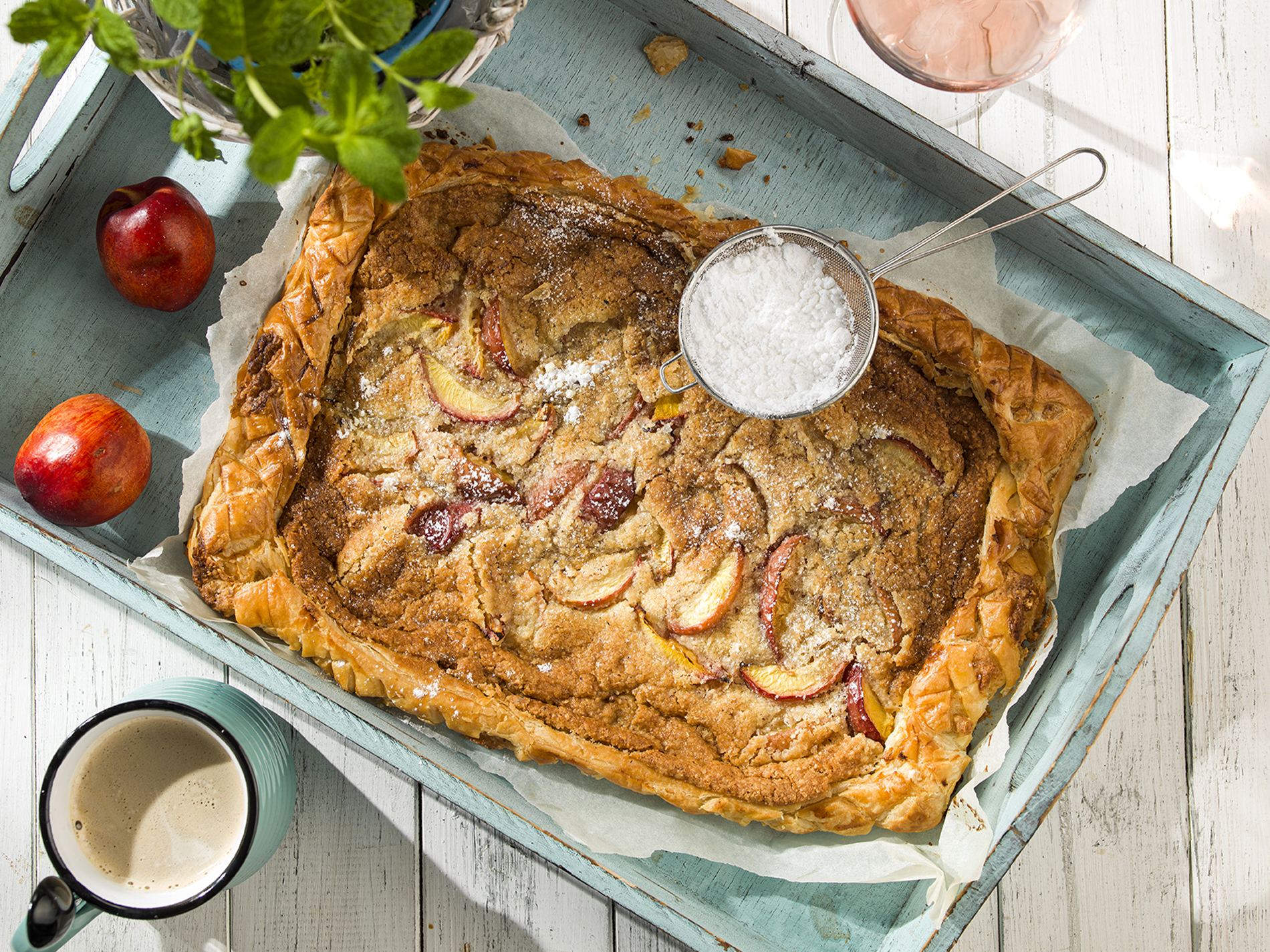 Nektárinky umyjeme a nakrájame na mesiačiky. Žĺtok rozšľaháme s mliekom a zmesou potrieme cesto. Okraje našikmo narežeme nožom, ale neprekrajujeme. Na krém poukladáme mesiačiky nektáriniek.
