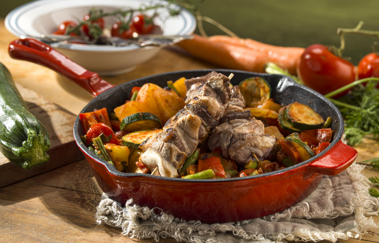 Na veľkej rajnici zohrejeme olej, opečieme na ňom cibuľu a cesnak, pridáme cuketu a tiež opečieme. Potom pridáme zemiaky, papriku a fazuľu, krátko opečieme a podlejeme rozdrvenými paradajkami aj so šťavou. Dochutíme soľou a korením a na miernom ohni dusíme 15 minút. Ešte raz dochutíme soľou a korením a posypeme čerstvým majoránom.