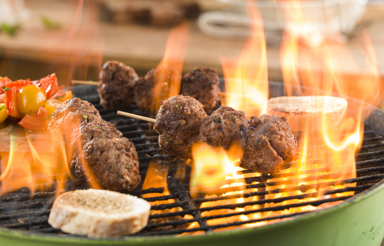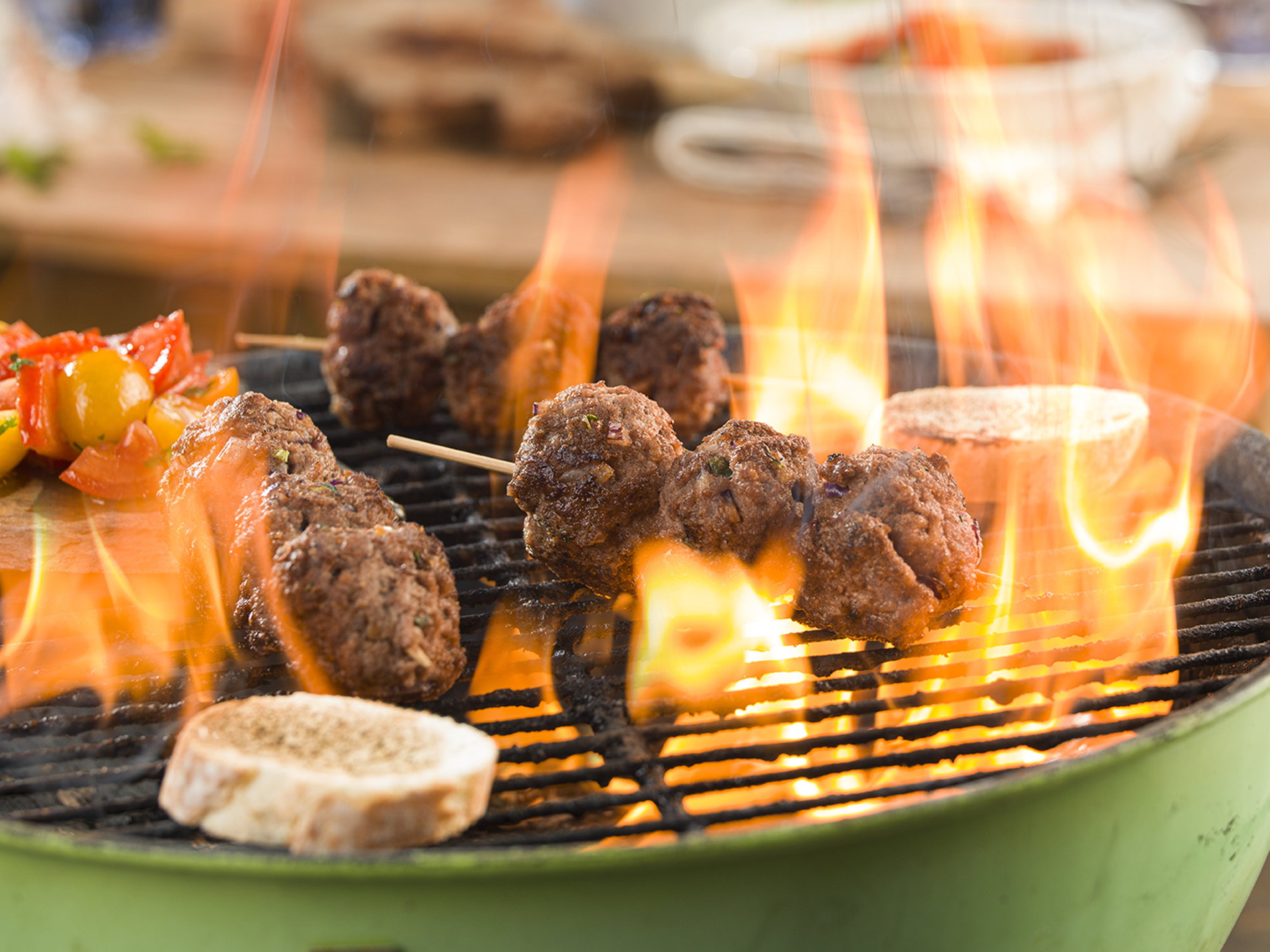 Mäsové guľky opečieme na 3 PL oleja sprudka a potom na miernom ohni dopekáme asi 15 minút. Opečené guľky na špízoch podávame s paradajkovým šalátom a čerstvou bagetou.