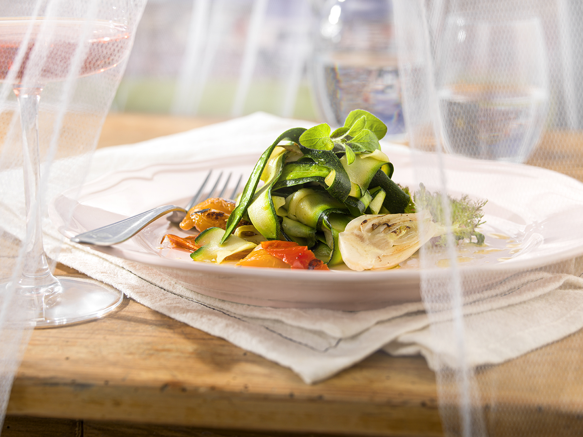 Plátky cukety grilujeme 3 až 4 minúty. Papriky grilujeme asi 10 až 15 minút z každej strany, až kým šupka nesčernie. Ugrilované papriky prekryjeme vlhkou utierkou a necháme 5 minút chladnúť. Potom šupku zlúpneme a papriky nakrájame na menšie kúsky.