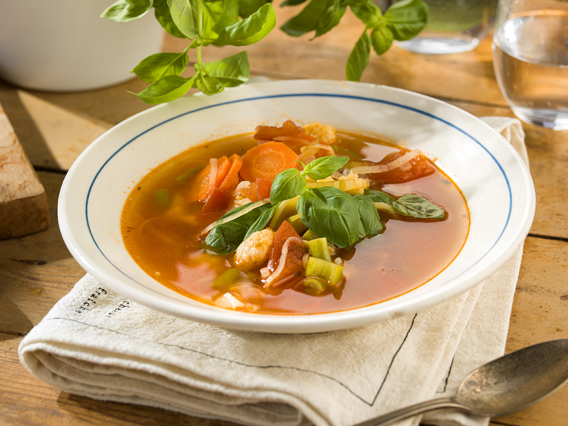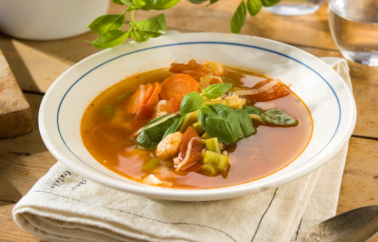 Zeleninu očistíme, umyjeme a nakrájame. Mrkvu, pór, zeler a cuketu na kolieska, paradajky na kúsky. Karfiol rozdelíme na ružičky, fazuľky prekrojíme na polovice. Cibuľu a cesnak nakrájame nadrobno.