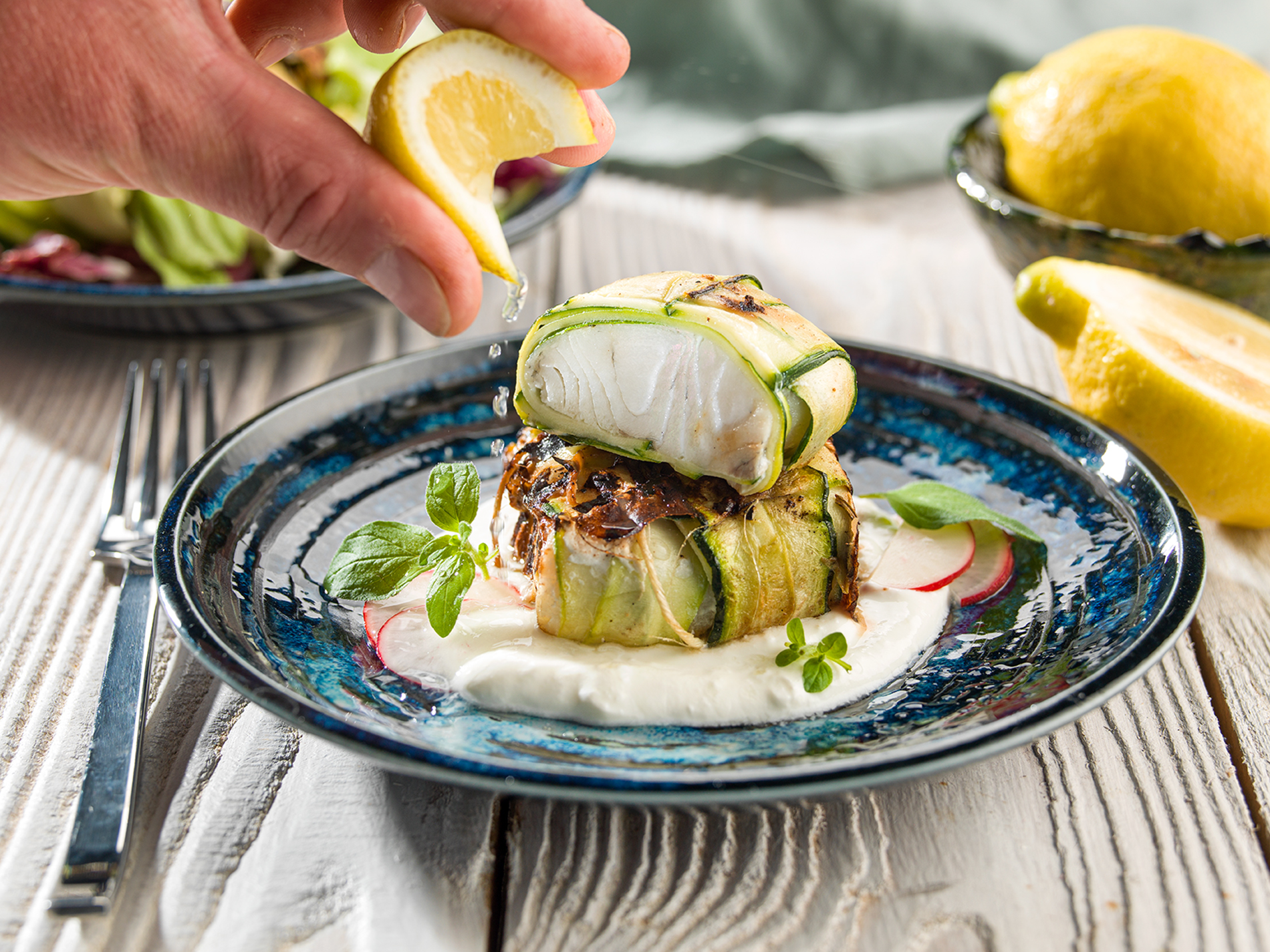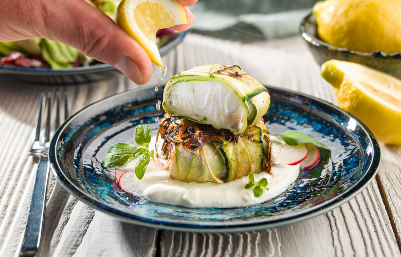 Plátky cukety osušíme papierovým obrúskom, vždy 2 plátky preložíme cez seba do kríža a do stredu položíme kúsok ryby. Cez rybu obtočíme cuketu a pomocou kuchynskej nite balíčky upevníme.