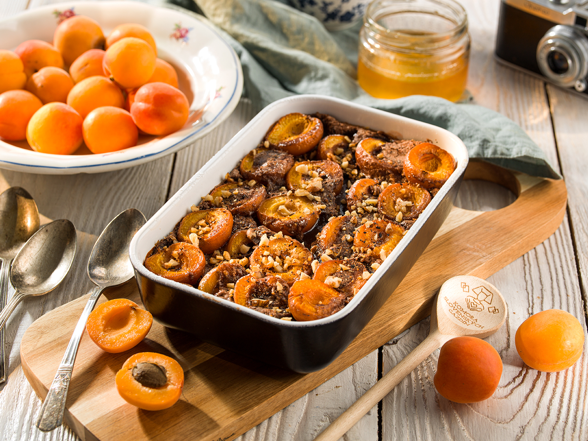 Do múčnej zmesi postupne vmiešame vaječnú zmes tak, aby vzniklo hladké cesto. Nalejeme ho do plytkej formy na zapekanie s priemerom 32 cm. Marhule poukladáme reznou stranou nahor na cesto a posypeme cukrom.