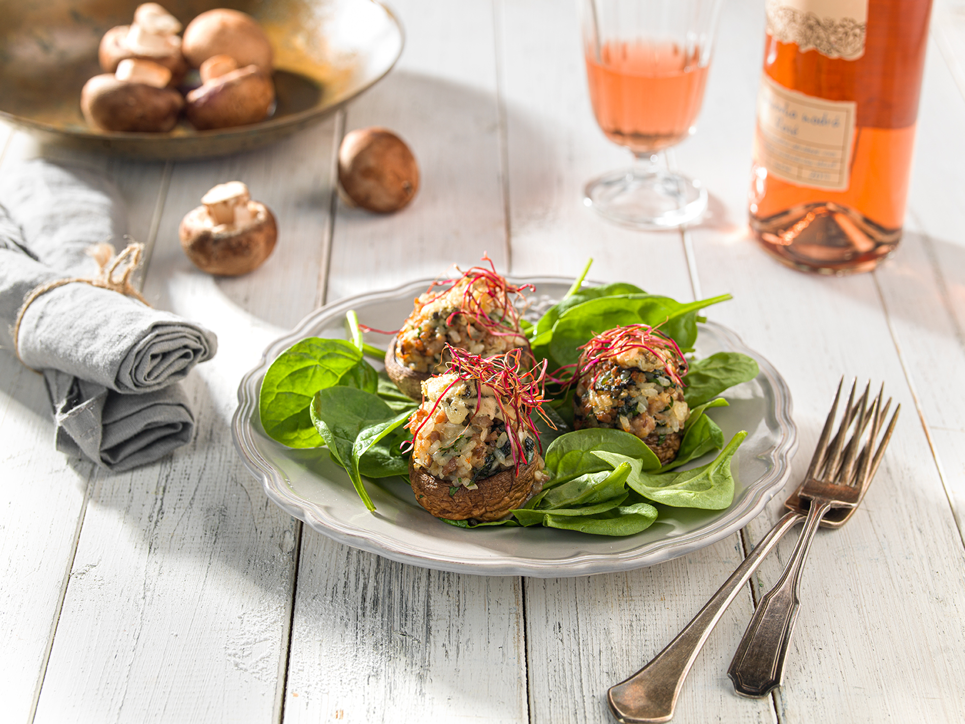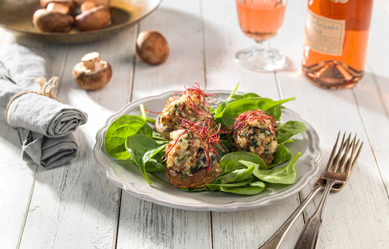 Do zmesi pridáme vajce, nasekanú petržlenovú vňať a tiež nasekaný sparený špenát alebo mangold. Zmesou naplníme šampiňónové klobúčiky a poukladáme ich do vymasteného pekáča.